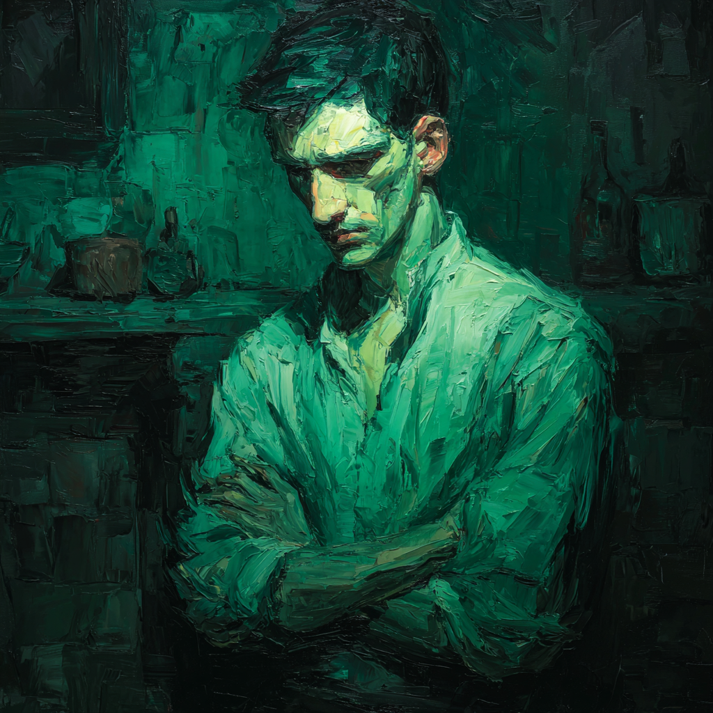 Neid tritt im Zyklus als schattenhafte Gestalt auf, voller nagender Unrast. Die Bilder im Kapitel des Neids sind kühl und doch brennend zugleich: Mit einem expressiven Pinsel werden verzerrte Spiegel, doppelte Gesichter und farbstichige Szenen geschaffen, in denen das Objekt der Begierde stets knapp außer Reichweite scheint. Zugleich tauchen abstrakte Elemente auf – brüchige Formen und kratzende Texturen, die den inneren Zerfall durch Neid visualisieren. Die Sprache dieser Sünde kommt als gehauchtes Gift daher: zischende Andeutungen, halb verhohlene Vergleiche – Worte wie Messer, leise ausgesprochen. In der musikalischen Untermalung dominieren klagende und schiefe Töne: ein langsames, düster-melancholisches Klangbild mit wehmütigen Streichern und verstimmten Pianomotiven, das an unterdrückte Tränen und bitteres Schweigen erinnert. Gelegentlich durchzieht ein dissonanter Flüstergesang die Stille – als würde der Neid selbst in einem Dutzend Stimmen sprechen. Dieses Zusammenspiel lässt den Zuhörer die innere Zerrissenheit spüren: Jeder Ton ist ein Tropfen Gift, der die Wunde des Neids weiter öffnet.