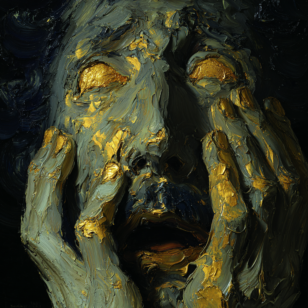 Habgier zeigt das Gesicht der unersättlichen Begierde. In Dark7Studio wird sie zur Gier nach dem Unfassbaren: Goldene Töne und düstere Schatten tanzen auf den Leinwänden um Schätze, die niemals genügen. Die Gemälde spannen den Bogen von surreal überzeichneten Szenen voll prunkender Details bis hin zu expressiv abstrakten Bildern, in denen Form und Bedeutung förmlich schmelzen – ein visueller Rausch, der die Obsession der Habgier spürbar macht. Die Sprache dieser Sünde ist ein geflüsterter Befehlston, schneidend und verlangend, doch oft ohne Worte: Habgier spricht mit dem Klirren von Münzen und dem Rascheln von Scheinen. Passend dazu zuckt die Musik nervös und treibend – ein Mix aus dunklen elektronischen Beats und industriellen Rhythmen, untermalt von entfernten Flüstereien. Diese Klangkulisse erweckt das Gefühl eines ruhelosen Marktplatzes der Seelen, in dem Verlangen niemals ruht. Der Hörer spürt in jedem Ton die kalte Gier, die alles vereinnahmen will und doch niemals satt wird.